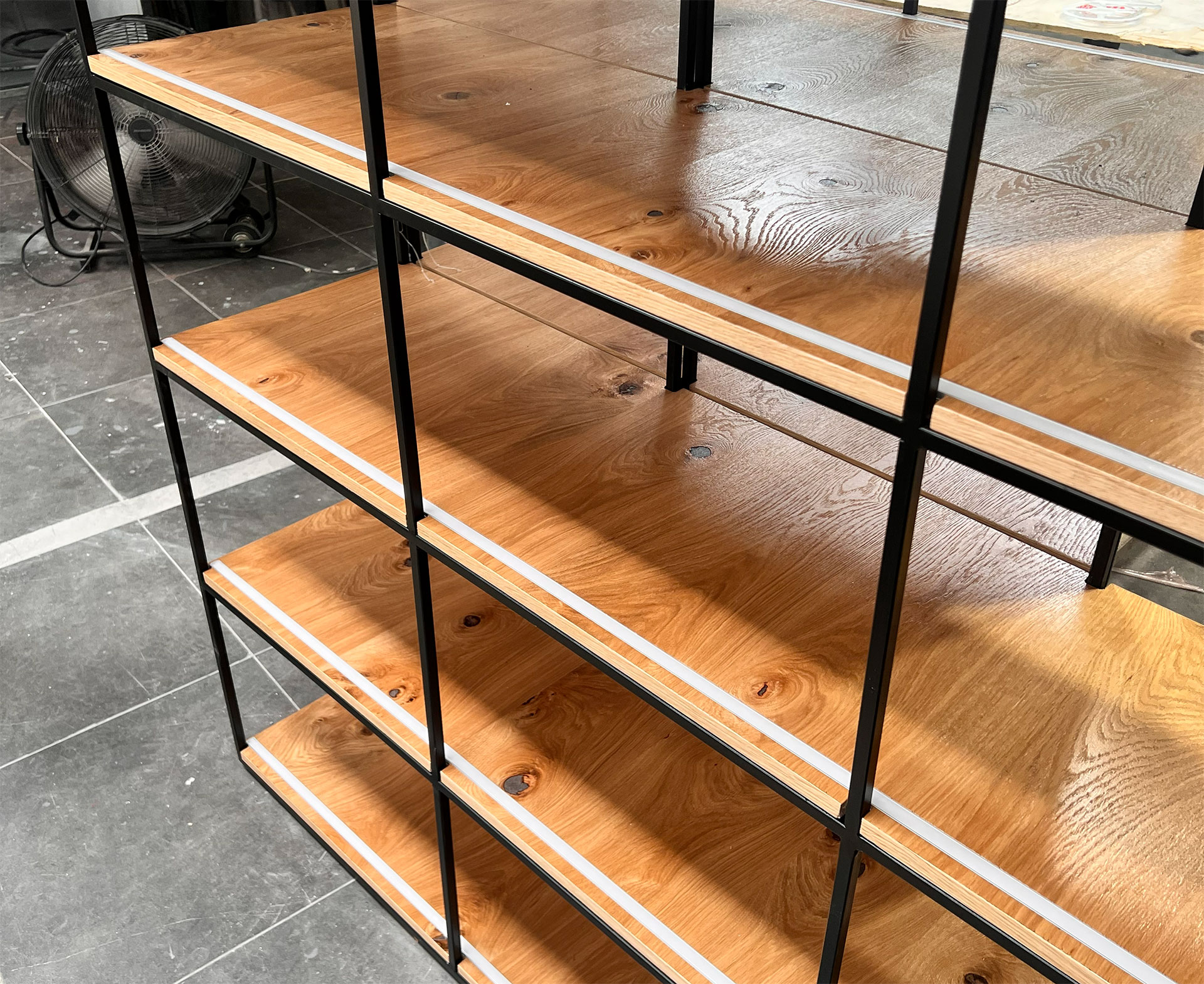 Soluzioni per vini in ferro, legno e plexiglass che assicurano corretta inclinazione, protezione dalla luce e presentazione ordinata, dalla mescita all’esposizione.