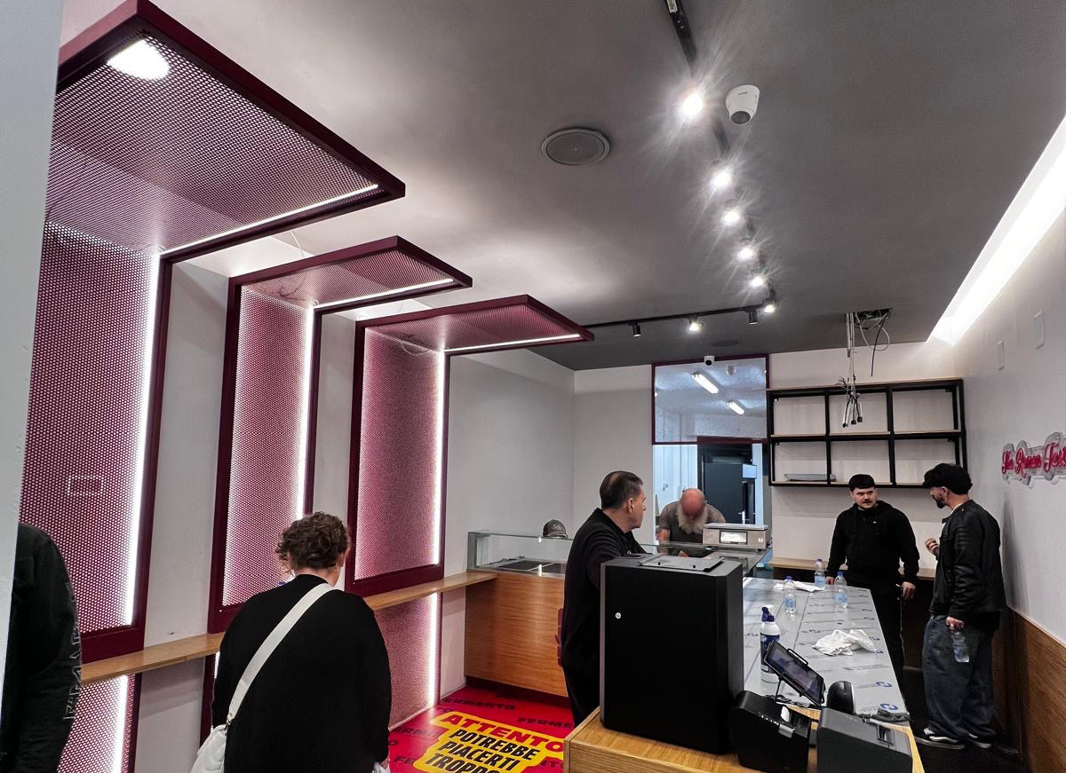 Sistemi modulari consentono passaggi impiantistici ispezionabili, branding integrato e uniformità cromatica tra zone operative e sala.