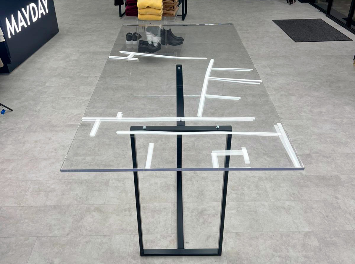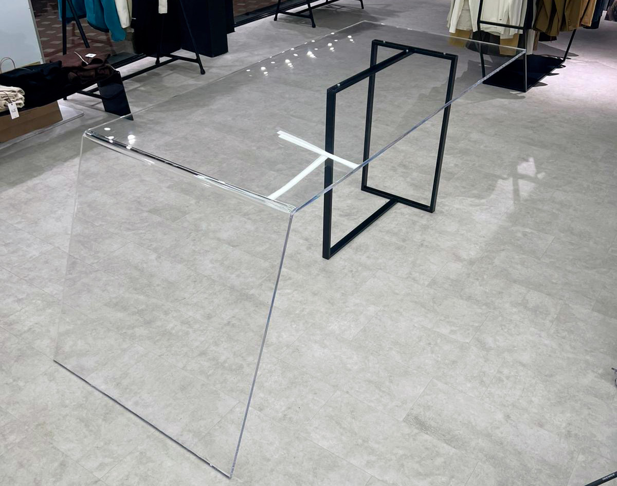 Tavoli e coffee table in plexiglass con piani trasparenti o opachi, bordi lucidati e strutture irrigidite per stabilità all’uso quotidiano.